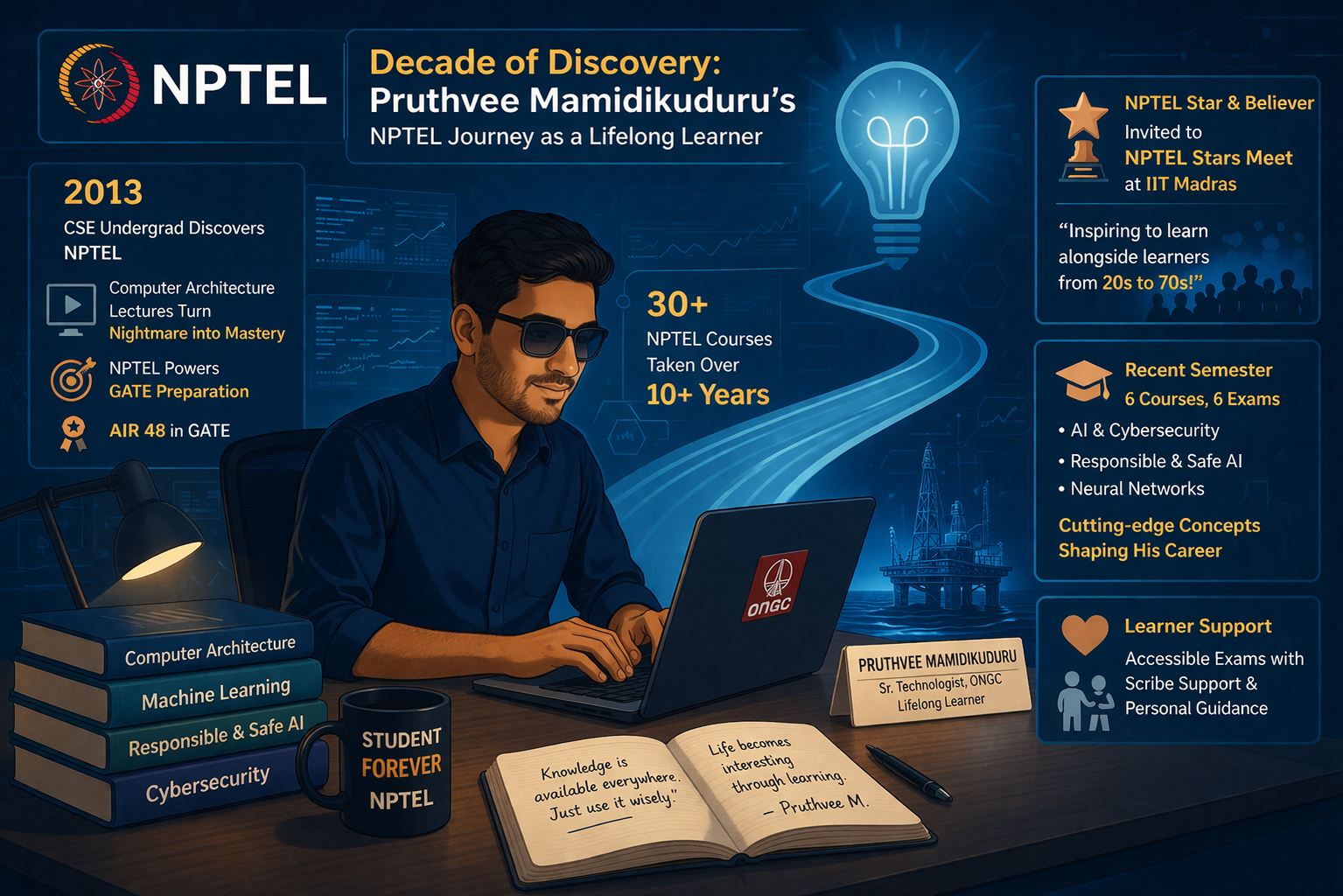 On most days, Pruthvee Mamidikuduru could easily pass for the archetypal busy technologist, managing high‑performance computing clusters at ONGC, coordinating with Geoscientists, and leading development of in‑house applications that keep a PSU running. Yet if you look a little closer, the label he chooses for himself is much simpler – student forever. Learning, in his story, is a thread that stitches everything together.